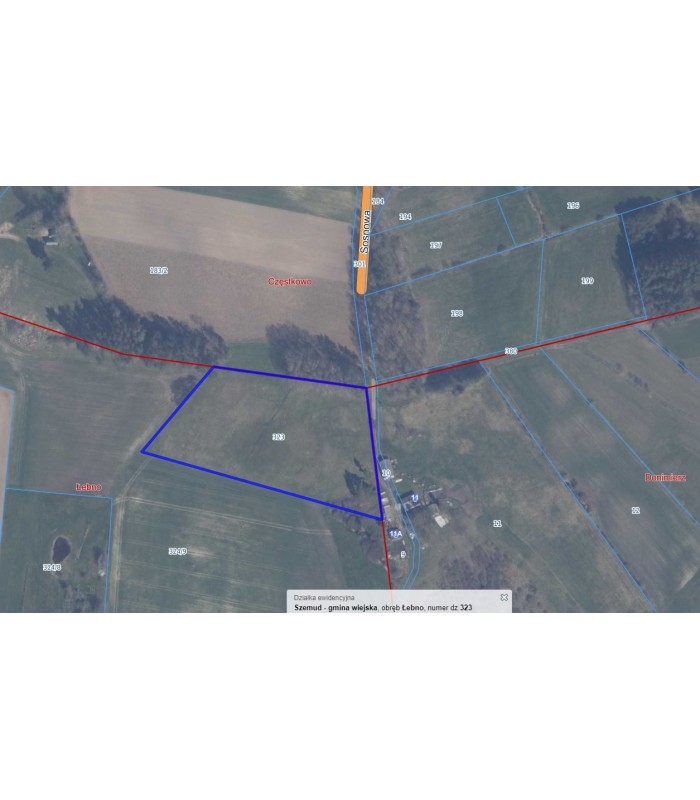 Działka siedliskowa o pow. 10 060 m², wydane warunki zabudowy na budowę budynku mieszkalnego i budynku gospodarczego w zabudowie siedliskowej wraz z infrastrukturą. Działka położona na obrzeżach wsi kaszubskiej należącej do gminy Szemud. W pobliżu nieliczne gospodarstwa rolne i budynki mieszkalne. W odległości 1,5 km od działki znajduje się przystanek PKS, dojazd do samej działki polną drogą około 400 m. Klasa gruntu łąki i nieużytki.